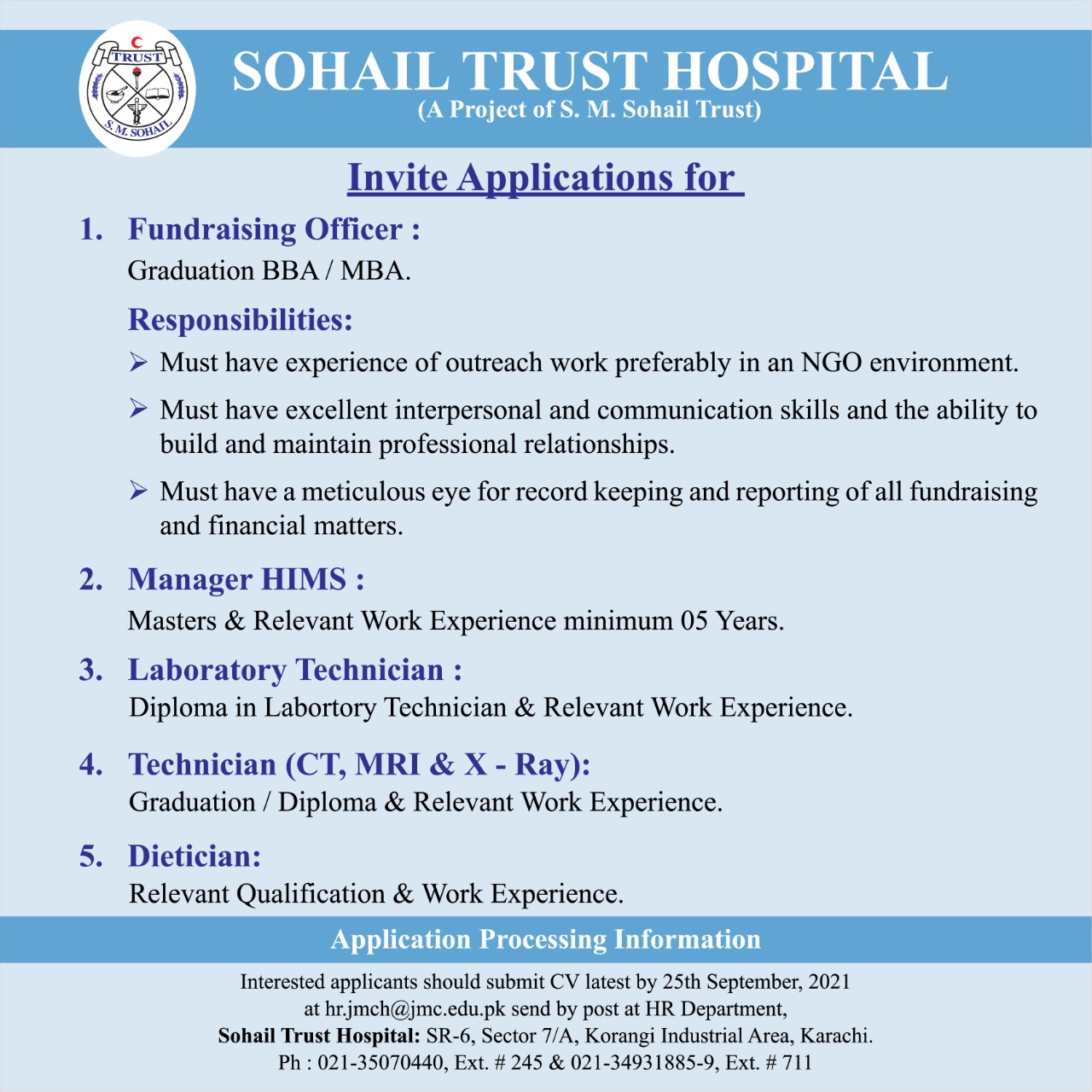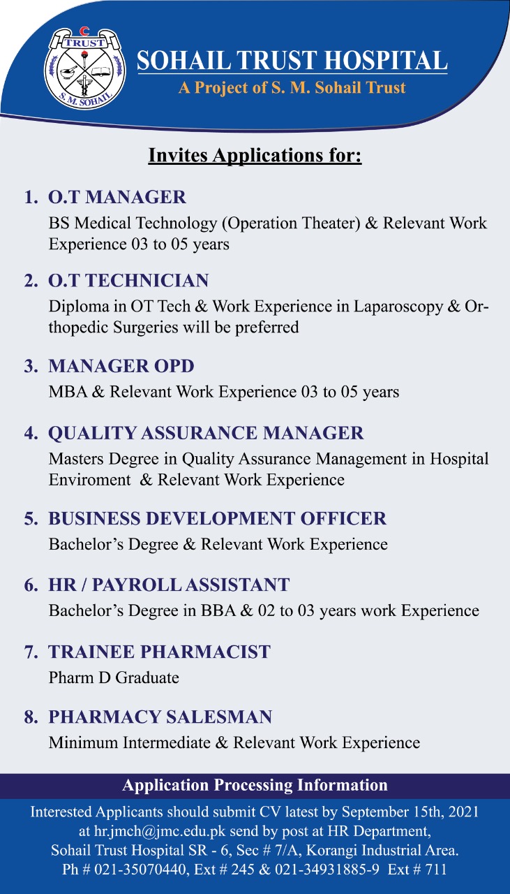 We are excited to discover the unique skills and perspectives that you can bring to Sohail Trust Hospital. We look for talented, forward-thinking and energetic individuals to join our team. We invite you to explore our job opportunities and find out how working here can help you achieve your personal and professional goals while you help to build your future. Be a part of STH and help us in helping others!